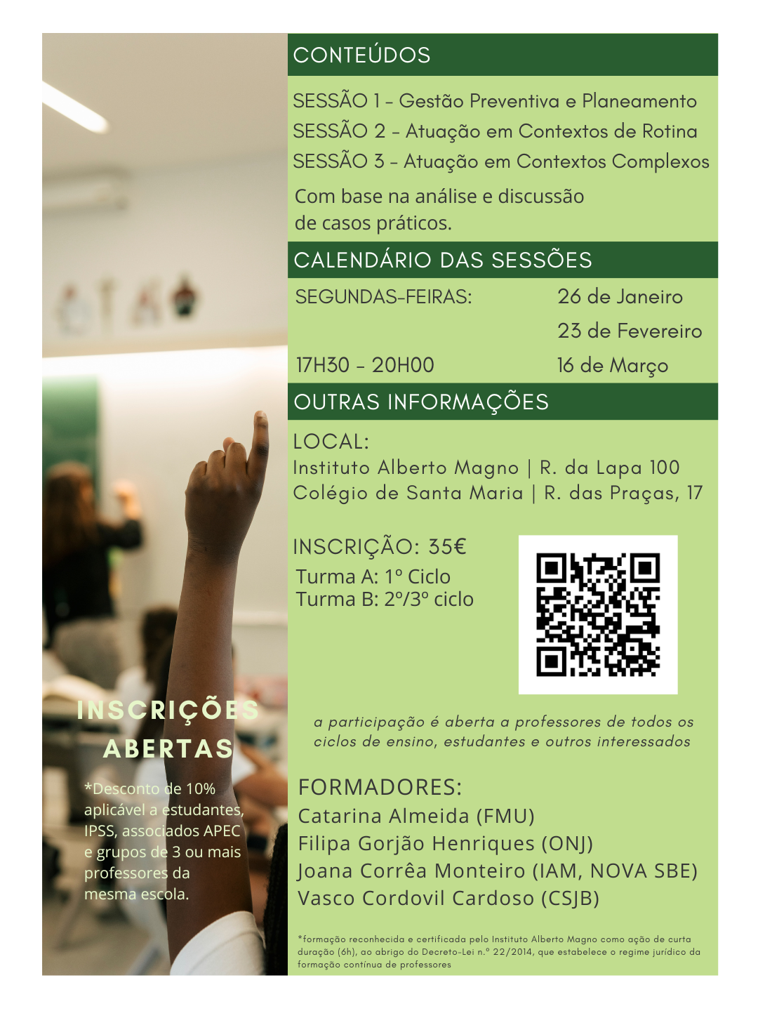 O Instituto Alberto Magno, em parceria com o Colégio de Santa Maria e a Fundação Maria Ulrich, promove a Ação de Curta Duração “A Gestão da Sala de Aula em Perspetiva: Casos Práticos e Estratégias”, dirigida a docentes do 1.º, 2.º e 3.º ciclos do Ensino Básico, bem como a professores de todos os ciclos de ensino e outros interessados na área da educação.